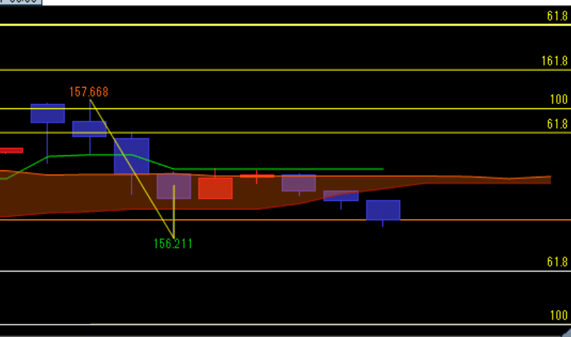 現在は、上値の157.98円を背に、じわじわと調整が入るかどうかを見極める時間帯だと見ています。