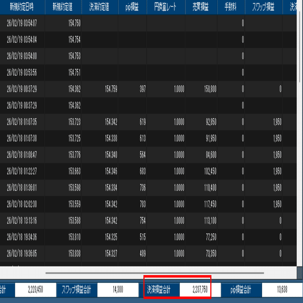 2月18日から2月19日、2日間の利益が「2,237,750円」となっております。